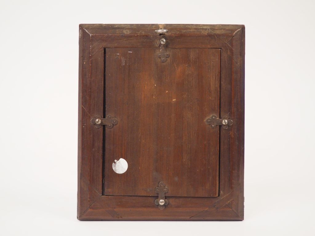 Plaque en émail peint polychrome représentant Saint François de Paul en gisant. Inscription sur une draperie tenue par deux anges Les dernières paroles de S François de Paule o bone Jesu Pastor bone Justos conserva peccatores Justifica et omnib’ fidelib’vivis et deffunctis miserere et propiti’ esto mihi peccatori . Limoges, fin du XVIIème - premier tiers du XVIIIème siècle. Hauteur : 11,5 cm – Largeur : 9 cm Dans un cadre d’époque Louis XIV en bois sculpté dans le goût de Bagard. Expert : Laurence Fligny