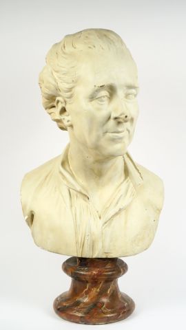 Portrait d'homme XIXème en plâtre, socle peint à l'imitation du marbre. H. : 60 cm