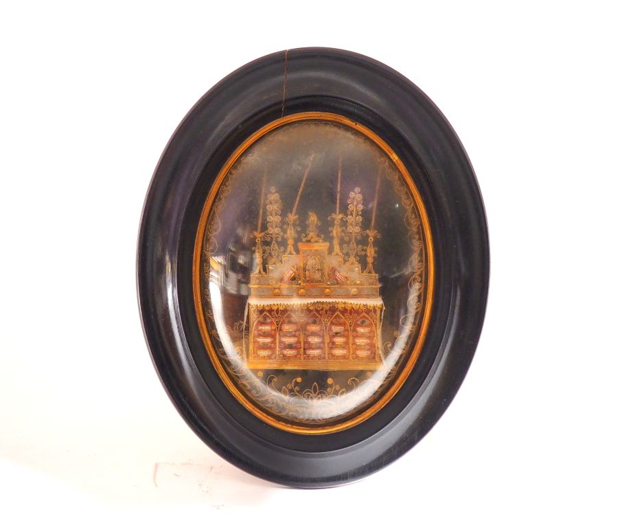 Reliquaire XIXème ovale en paperolle à décor de Maitre Autel, cadre en bois noirci fendu. Dim. 31 x 24 cm