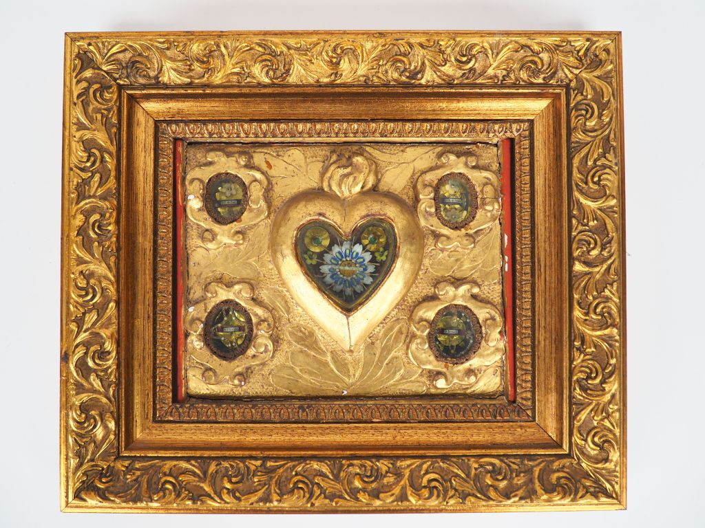 Reliquaire XVIIIème en paperolle, bois et stuc doré, dans une plaque à décor de Sacré Cœur. Cadre moderne en bois doré Dim. 18 x 22 cm