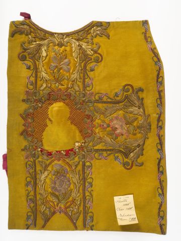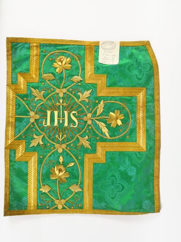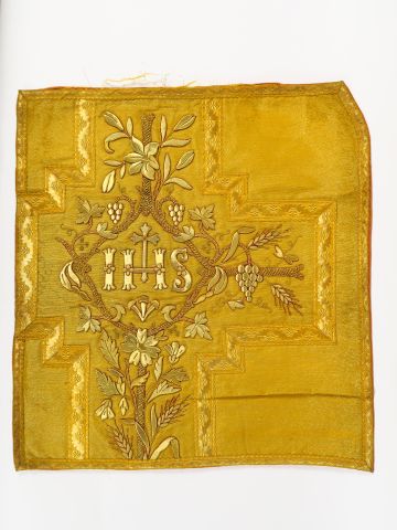 Réunion de 5 documents textiles liturgiques brodés. XXème siècle Circa 60cm/60cm Modèles destinés à des chasubles des chapes ou des dalmatiques. Fond d’or, broderie d’application filé or sur cartisane, décor aux épis de blé, grappes de raisin et fleurons dans le gout de la Renaissance. Bel état Expert : Véronique Dumont Castagné