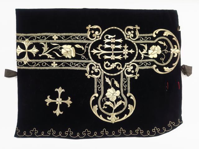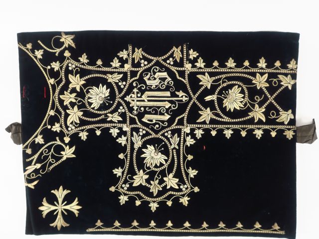 Réunion de 6 documents textiles liturgiques brodés. XXè siècle Circa 60cm/60 cm. Modèles destinés à des chasubles des chapes ou des dalmatiques, 2 d’entre eux sont sur fond de velours de soie grenat brodés de soie et filé or. 4 autres sont des modèles de deuil sur fond de velours de soie noir, brodé filé argent sur cartisane. Bel état Expert : Véronique Dumont Castagné
