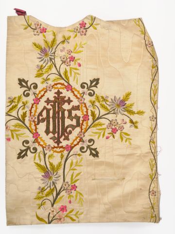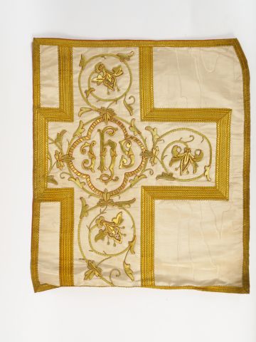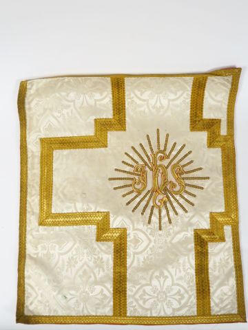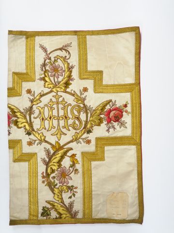 Réunion de 6 documents textiles liturgiques brodés. XXème siècle Circa 60cm/60cm Modèles destinés à des chasubles des chapes ou des dalmatiques. Fond satin de soie blanc moiré ou façonné. Broderie d’application filé or sur cartisane au décor dans le gout de la Renaissance. Bel état sauf pour l’un d’entre eux. Expert : Véronique Dumont Castagné