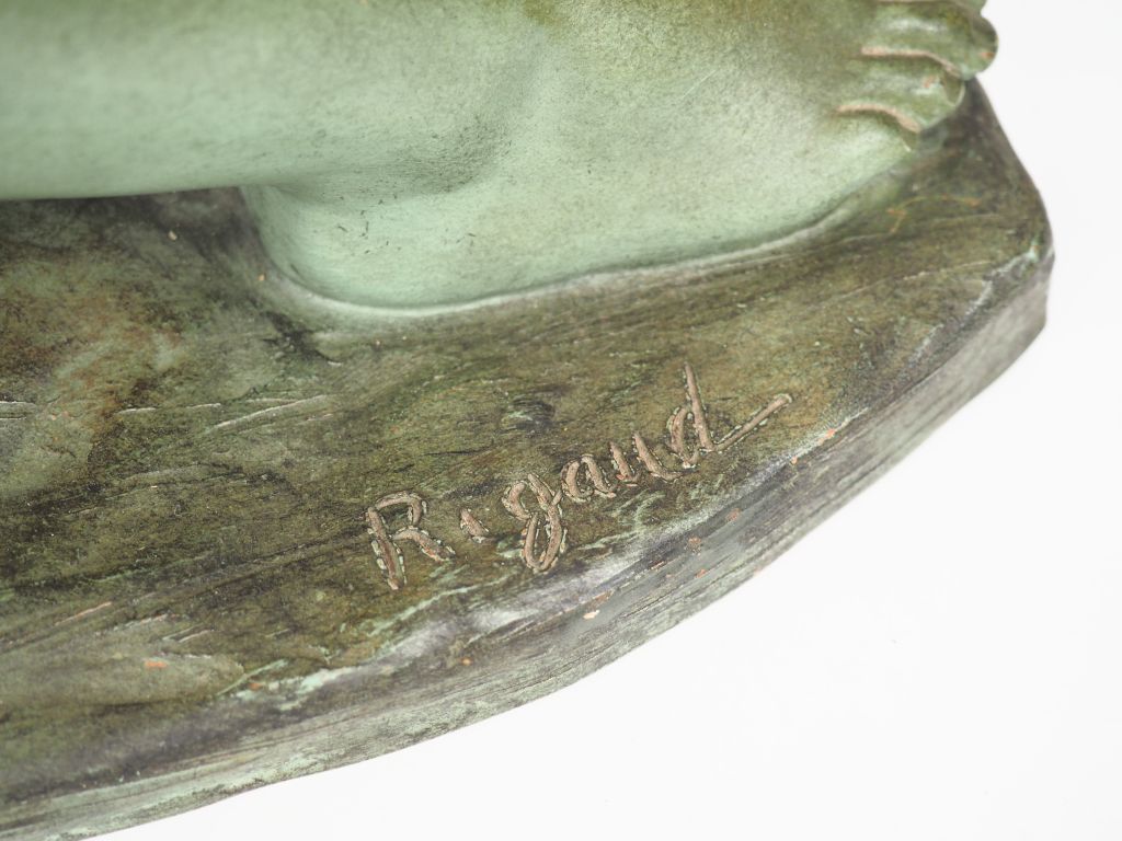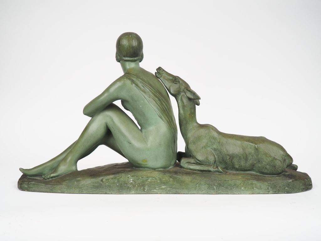 RIGAUD. "Jeune femme à la biche" Groupe en terre cuite à patine verte à l'imitation du bronze Signé Dim 38 x 69 x 17 cm (léger choc sur le nez, un pied de la biche cassé et recollé).