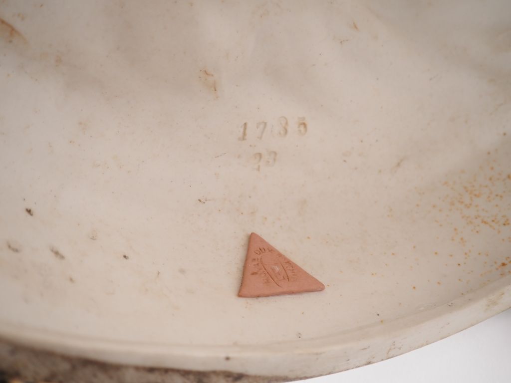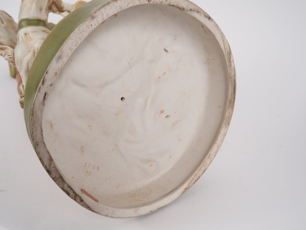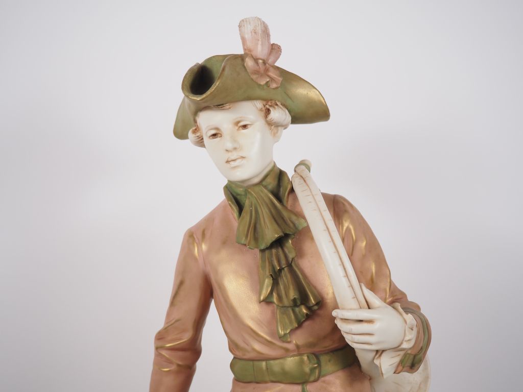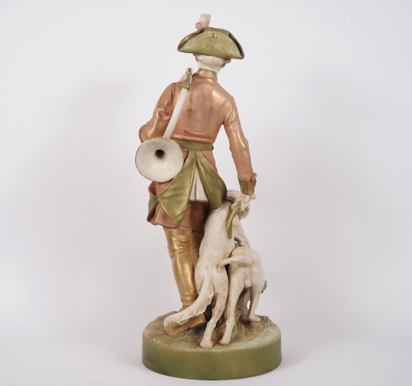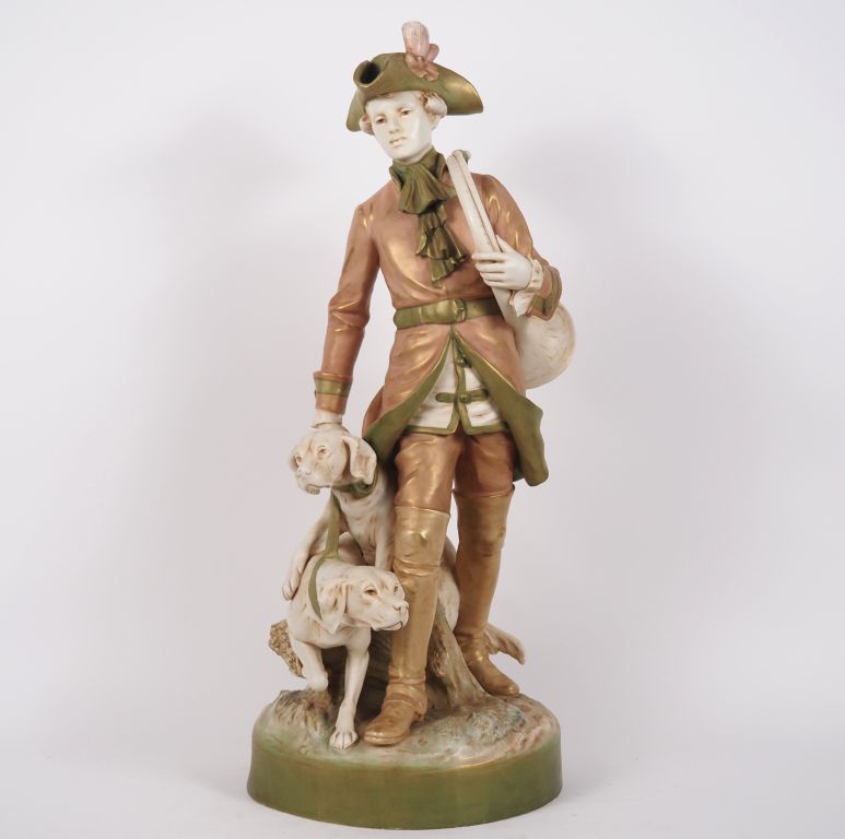 ROYAL DUX. Grand groupe en biscuit polychrome "chasseur et ses deux chiens". H. 70 cm