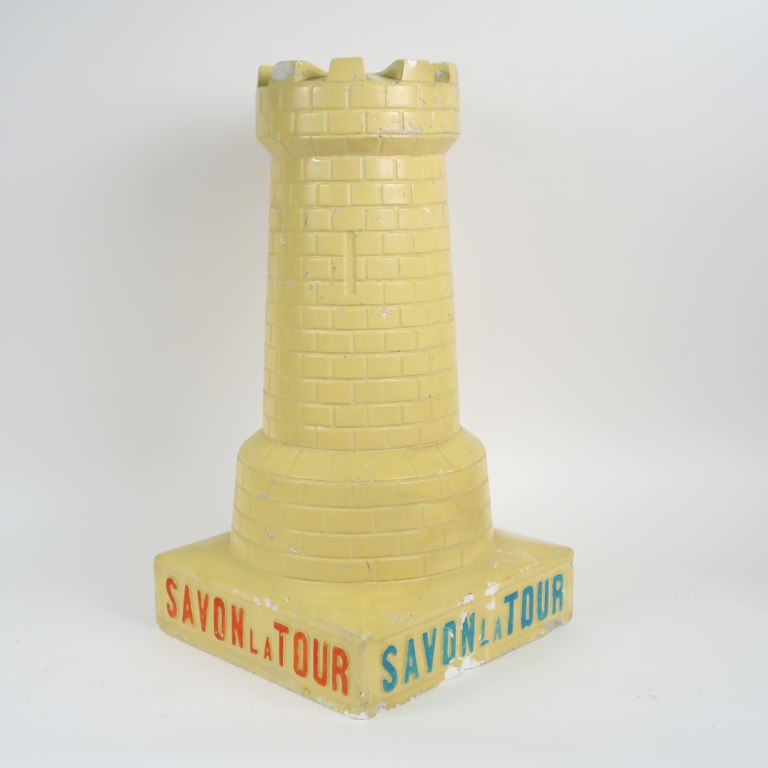 SAVON LA TOUR. Grand présentoir en plâtre.patiné et polychrome. H. : 52 cm. (accidents et restaurations)