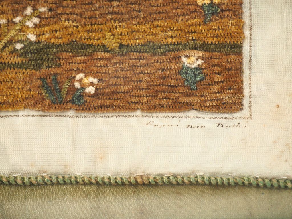 Soie imprimée et dorée Empire, à décor de jeune fille au panier de roses. Dim. À vue : 22 x 26 cm