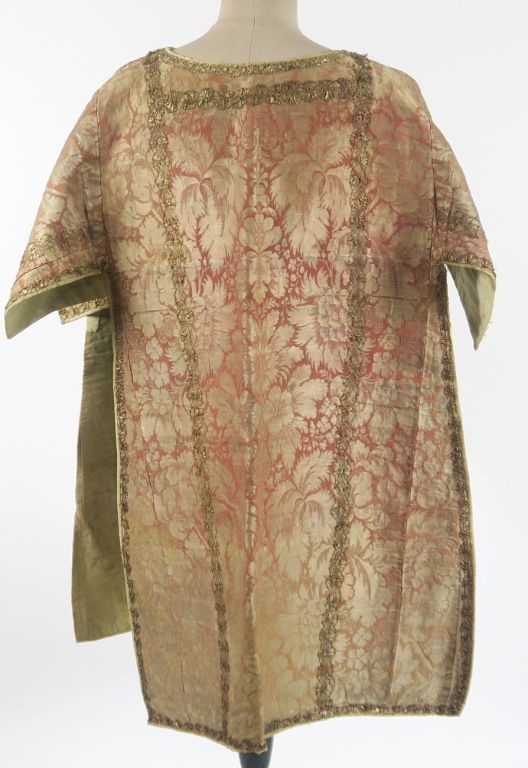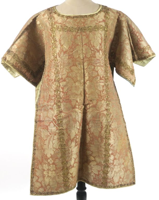 Somptueuse dalmatique Louis XV avec son manipule, étoffe façonnée,à décor lancé aux fils d’or, dentelle or d’époque, doublure soie verte. Bel état général. Expert : Véronique Dumont Castagné