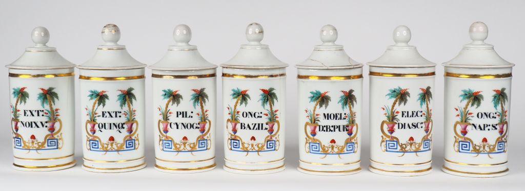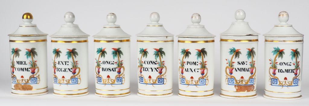 Suite de 14 pots de pharmacie en porcelaine polychrome. H. 24,5 cm. (quelques fels et accidents).