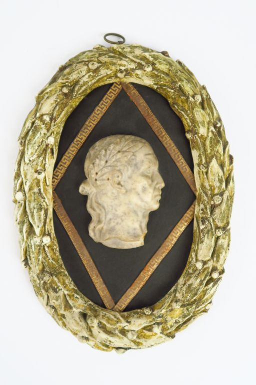 Sujet d’après l’antique en marbre "Profil de César" dans un cadre médaillon en stuc. 28,5 x 20 cm