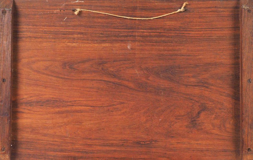 Tableau Art Déco en marqueterie de bois exotiques à décor de paysage lacustre animé. Dim. 36 x 56,5 cm.