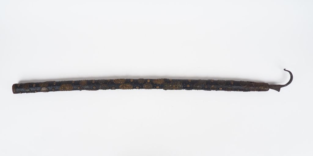 Tire barque en bois et laiton à décor d'armoiries, de pièces et de clous. H. 100,5 cm
