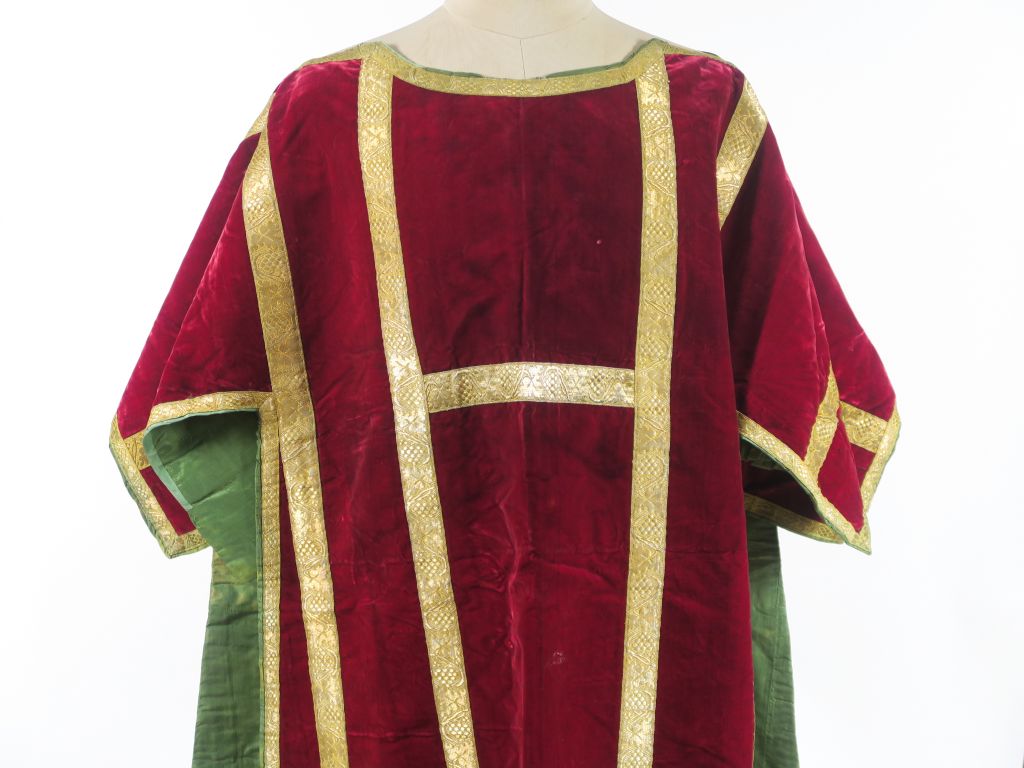 Très belle dalmatique XVIIIème - XIXème en velours de soie rouge incarnat, galons d’or, à décor de grappes de raisins, doublure en soie verte. Bel état général. Expert : Véronique Dumont Castagné