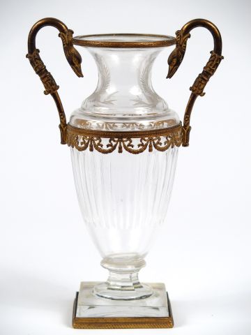 Vase à anses de style Louis XVI en cristal, monture en métal doré. H. 23 cm