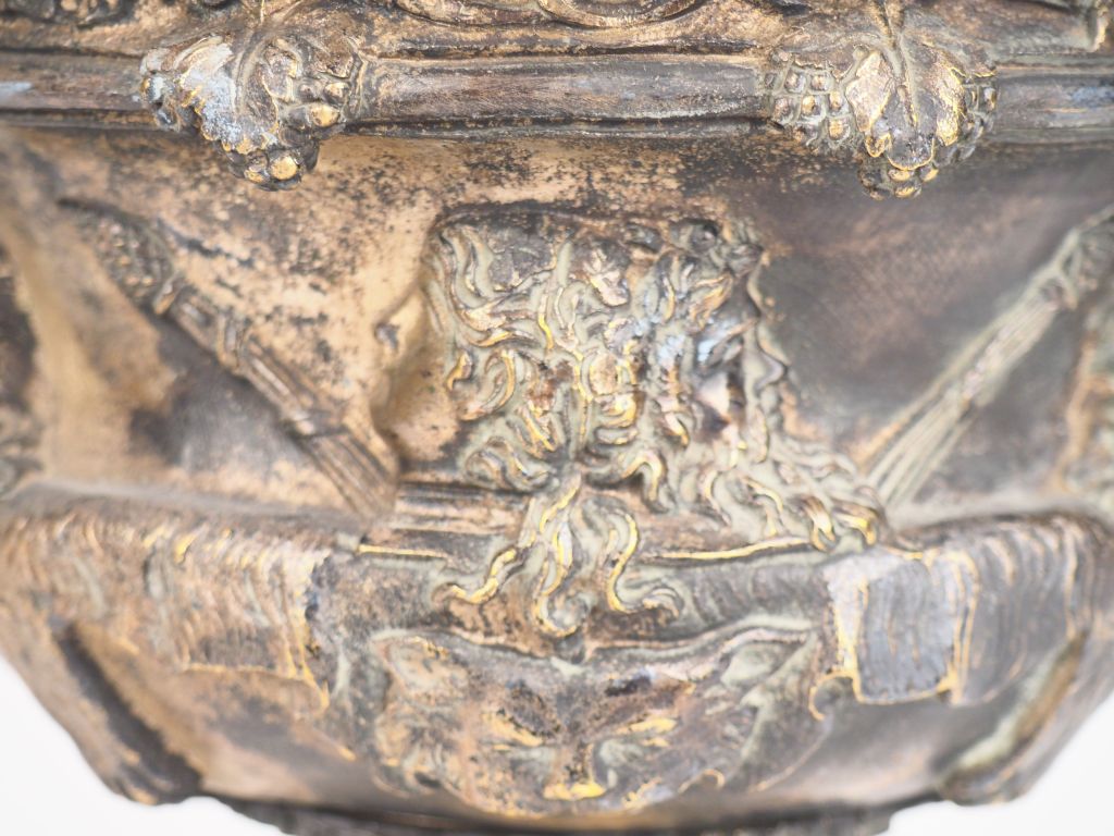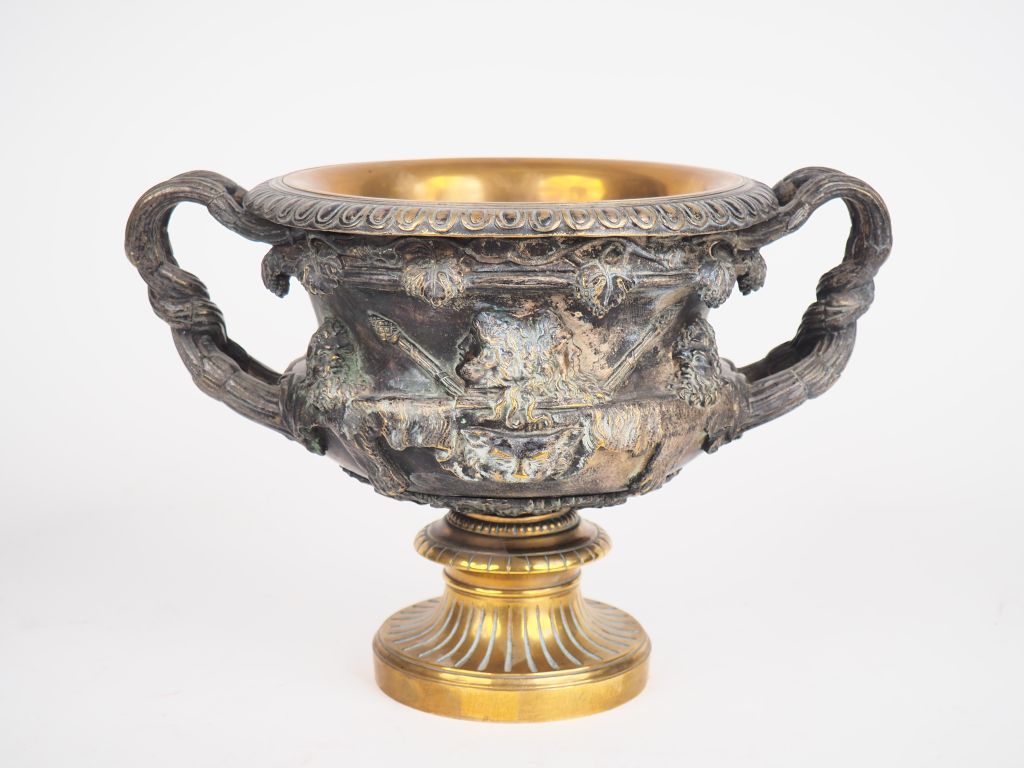 Vase dit "Warwyck" XIXème en bronze à décor de têtes d'hommes et de pampres. Dim. 20 x 29 x 20 cm.