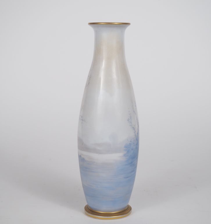 Vase Napoléon III en opaline, à décor de paysages lacustres et de châteaux en camaieu bleu. Signé NATTIER. H. 25 cm.