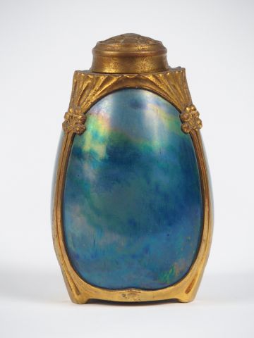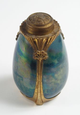 ZSOLNAY. Pot en céramique irisée bleu-vert, monture en métal doré signée Orion et numéroté 206. H. : 14,5 cm