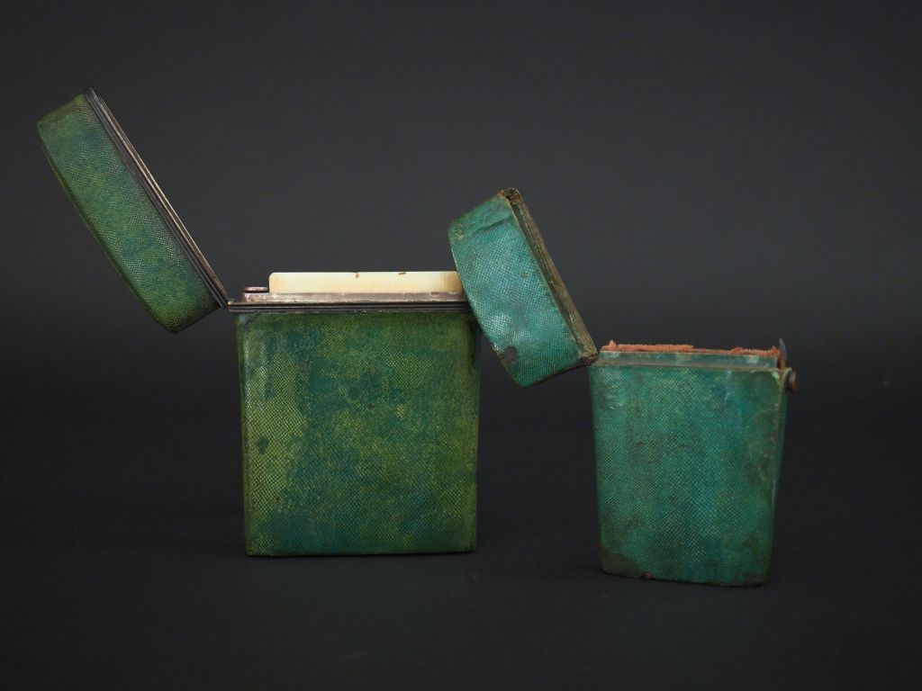 2 différents étuis rectangulaires XIXème en galuchat vert, monture en argent pour l'un avec un crayon signé Longmore à Londres. Dim. 11,2 x 8,5 cm. Dim. 9,7 x 6,5 cm. (usures).