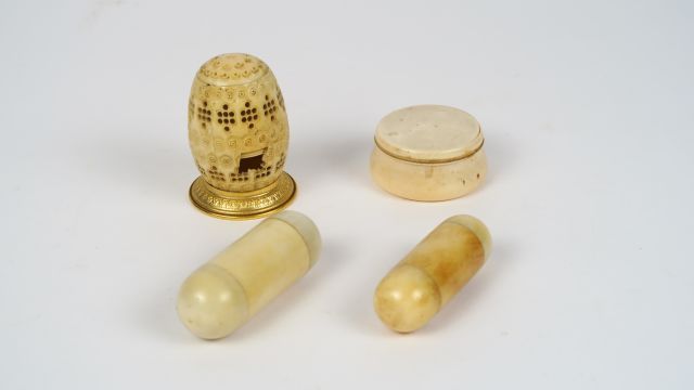 2 étuis à aiguilles , boite en ivoire (accident), œuf à chapelet en ivoire ajourée (accidenté)