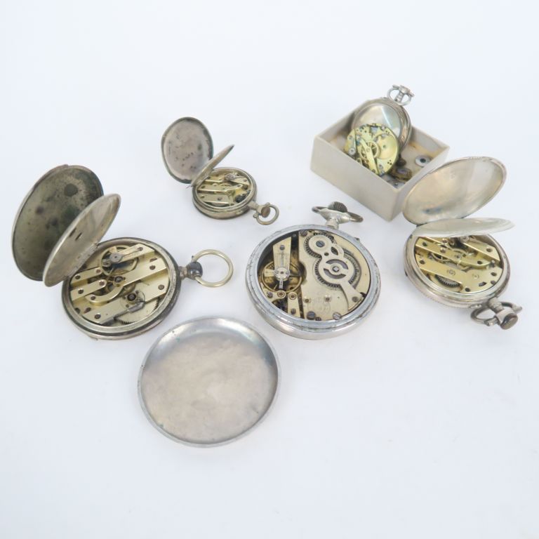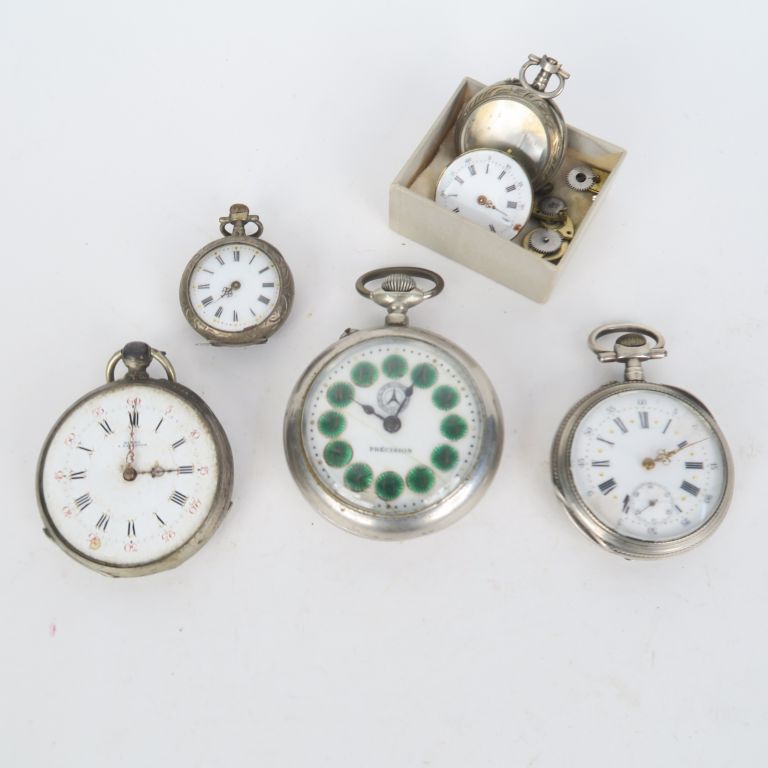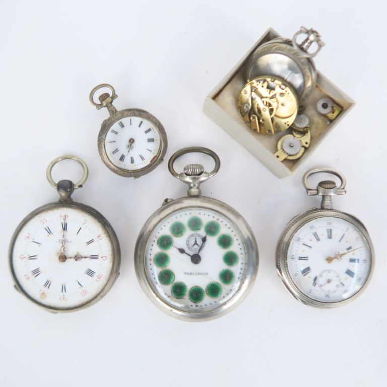 3 montres de gousset et 2 montres de col, cadrans émaillés. Diam. de 3 à 5 cm. (accidents)