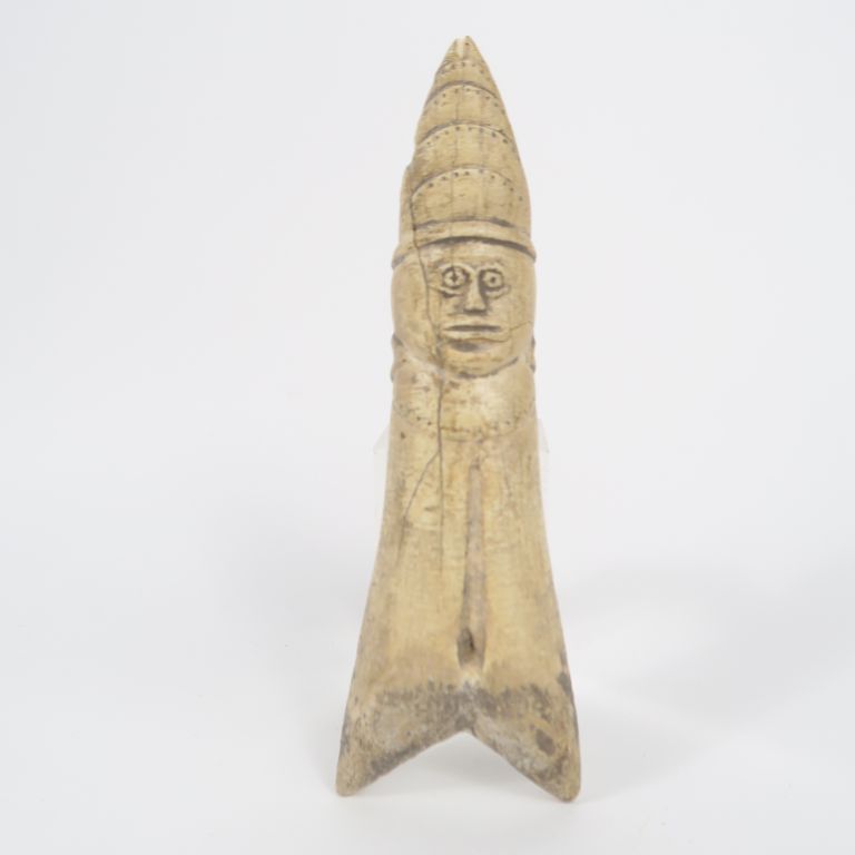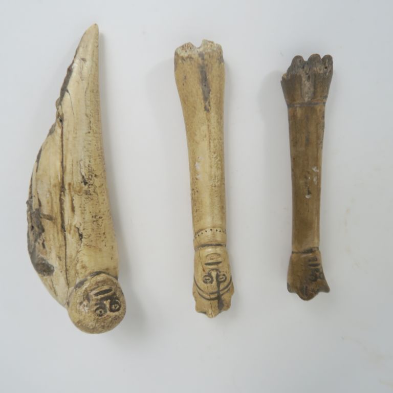 4 anciennes figurines en os sculpté. 4 x 3 x 13 à 15,5 x 5,5 x2,5 cm (accidents).