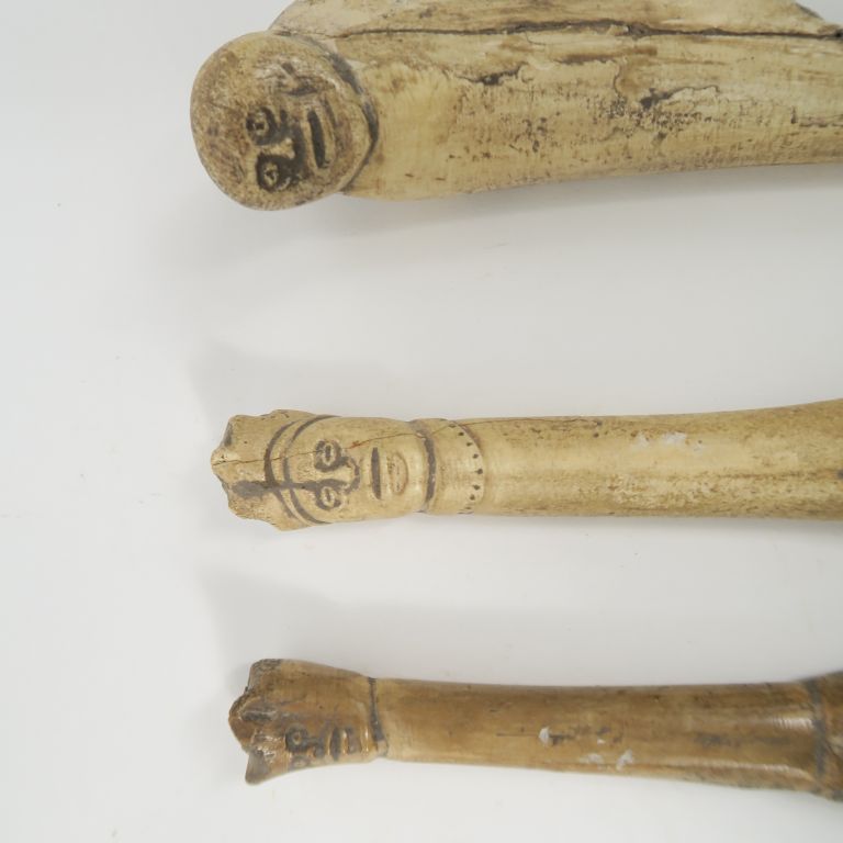 4 anciennes figurines en os sculpté. 4 x 3 x 13 à 15,5 x 5,5 x2,5 cm (...