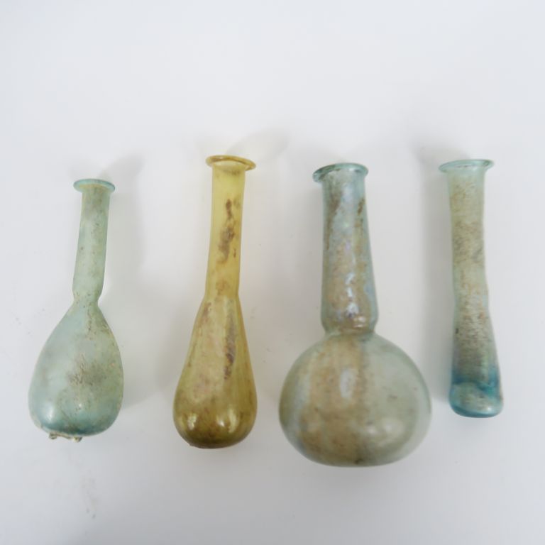 Lot de 4 balsamaire romains en verre translucide. I-IIIe s. apr. J.-C.12,5 x au prix de 80 à 120 € en vente aux enchères par l'hôtel des ventes Primardeco