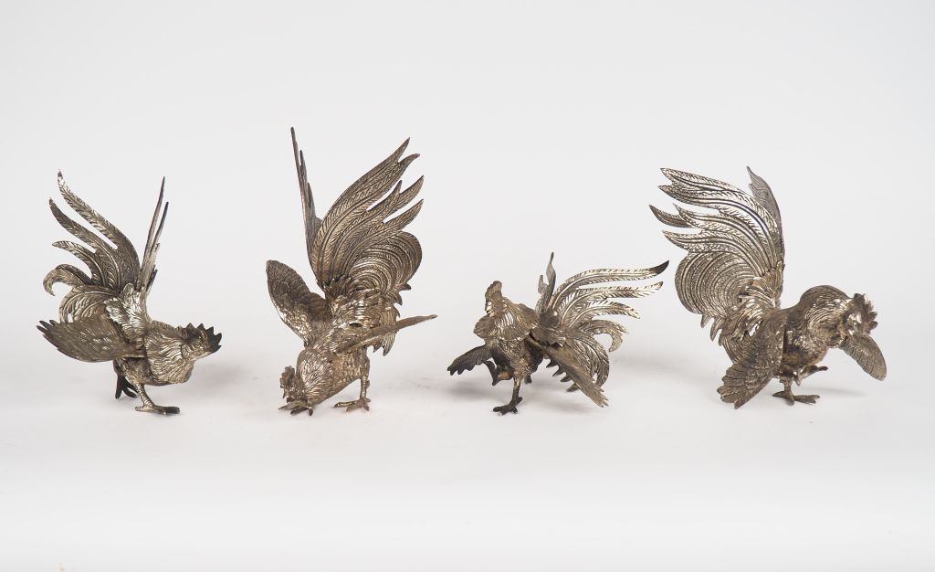 Lot de 4 coqs de de bruyère en métal argenté. au prix de 40 à 60 € en vente aux enchères par l'hôtel des ventes Primardeco