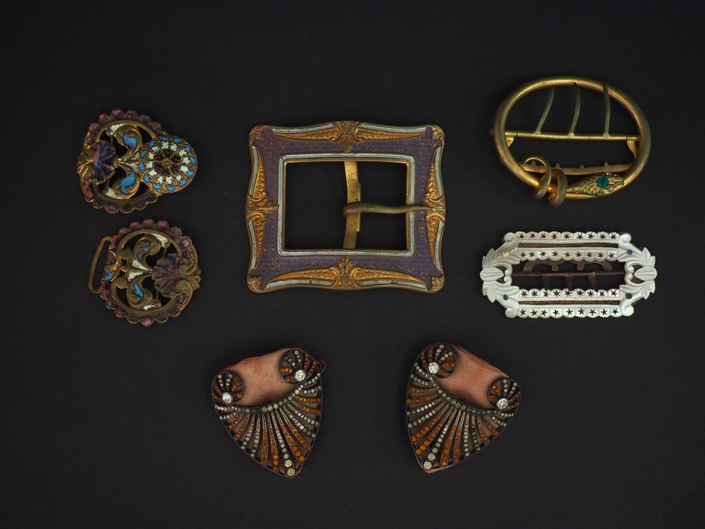4 différentes boucles de ceinture et une paire d'ornements de style Art Déco.