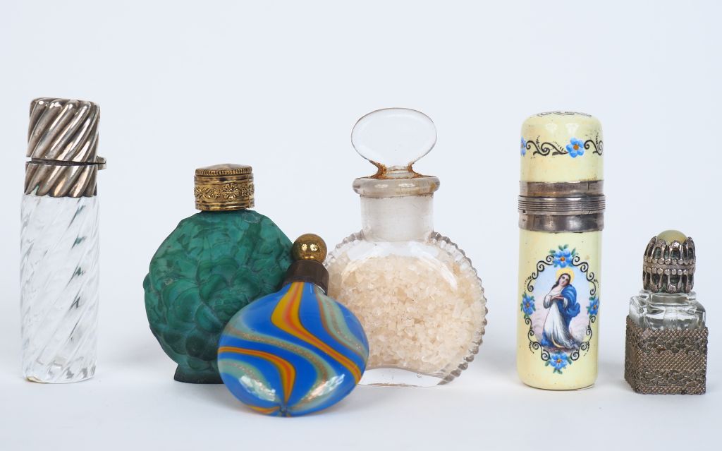6 différents flacons à sels ou à odeurs en verre, émail, cristal, métal et composition. H. 4 à 6,5 cm.