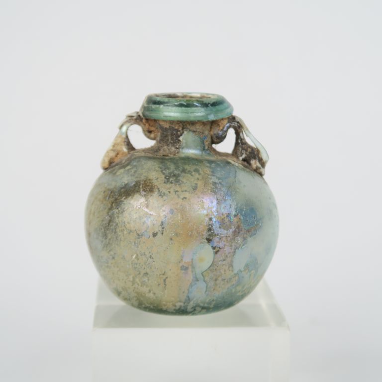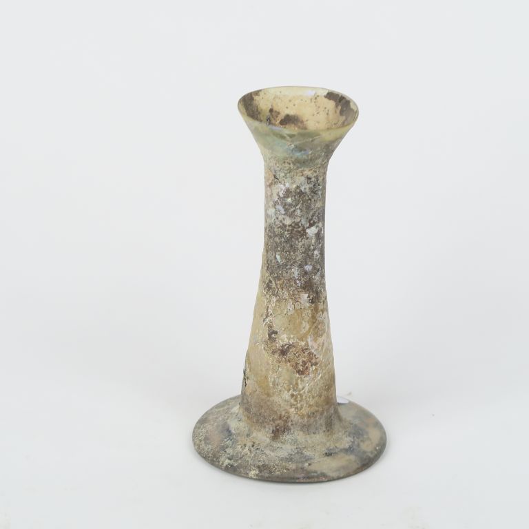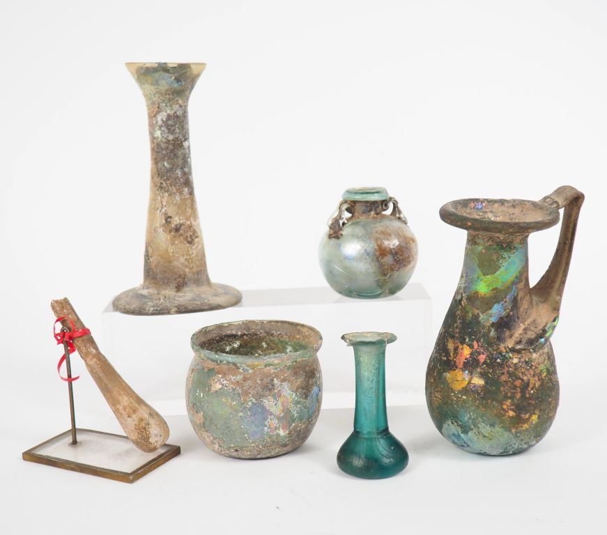 6 verreries antiques (accident, manques, restauration et reconstitution ?). 6 à 13 cm.