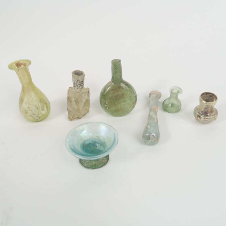 Lot de 7 verreries romaines et islamiques. 8 x 2 à 3 x 2 cm au prix de 80 à 120 € en vente aux enchères par l'hôtel des ventes Primardeco