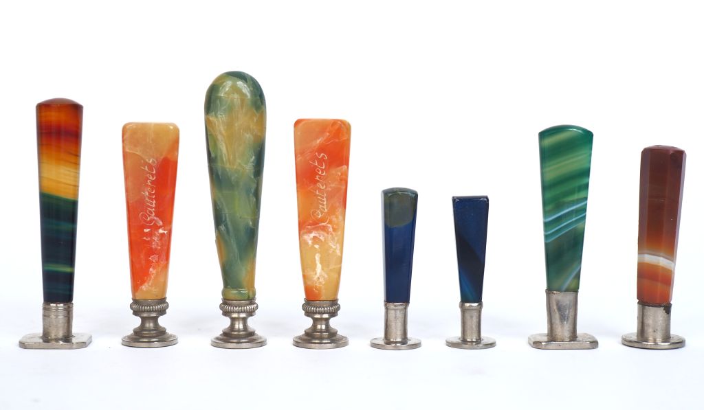 Lot de 8 cachets en pierre dure, composition et métal argenté. H. de 4 à 7,5 au prix de 30 à 40 € en vente aux enchères par l'hôtel des ventes Primardeco