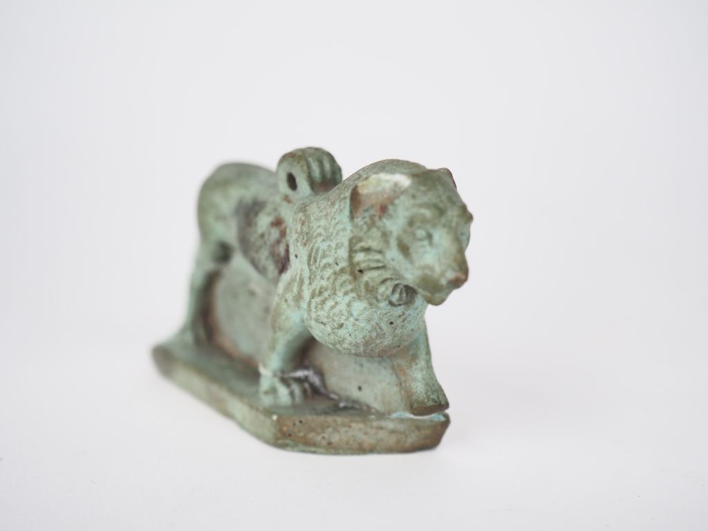 Amulette en faïence egyptienne fiugrant un lion marchant. Basse époque (664 - 332 a.v J.C) ou époque ptolémaïque. Accidents collages et manques Dim. 4 x 6,5 cm. On y joint Un figurine zoomorphe dans le goût egyptien. Expert : Jean-Sylvain Caillou, EI.