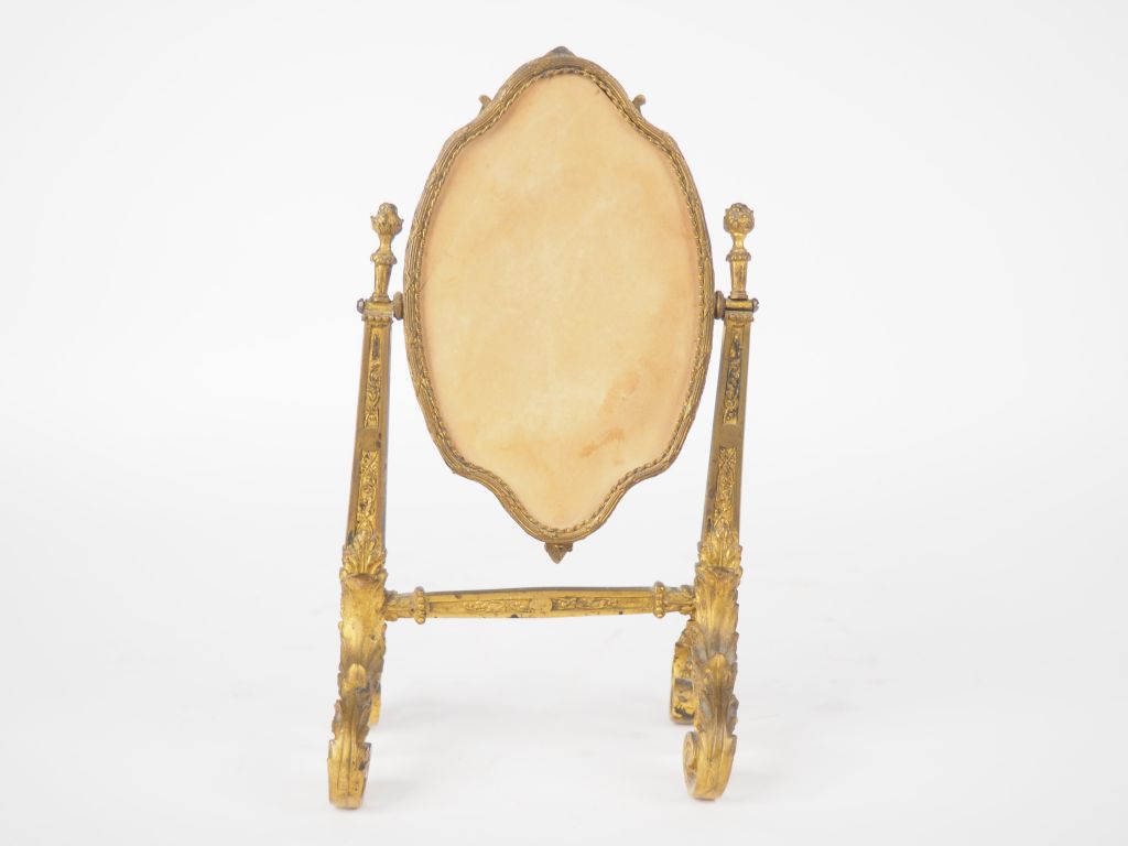 Bel émail 1900 figurant "portrait de jeune fille chapeautée" dans une monture de style Louis XVI en bronze doré en forme de psychée. Email monogrammé H. 24 cm