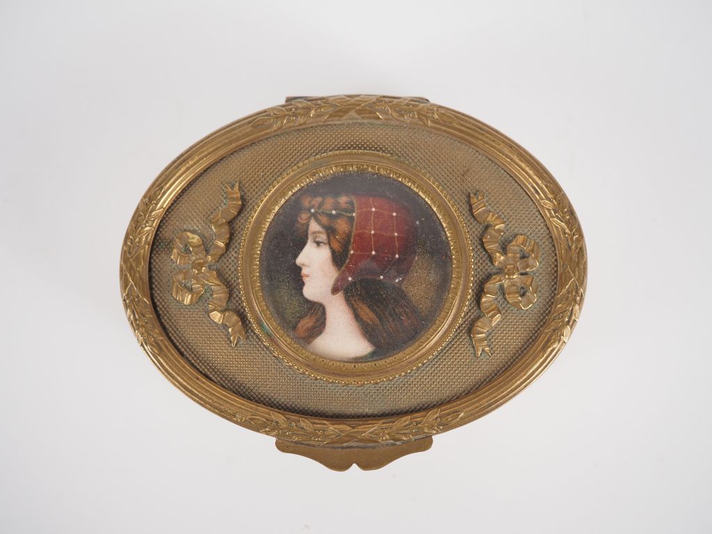 Boîte à bijoux 1900 de style Louis XVI en laiton doré, ornée en son centre d'une miniature "jeune fille au fichu", ouvrant sur un interieur en velours.