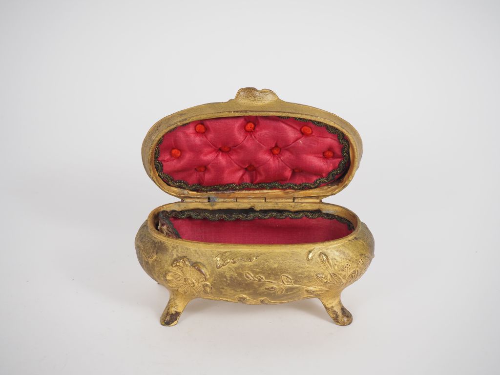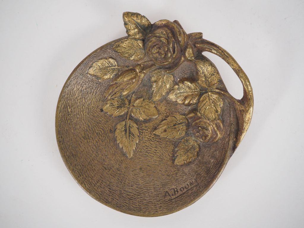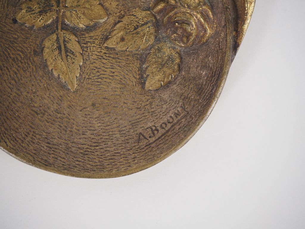 Boîte à bijoux de style Art Nouveau en bronze à décor de feuillages et de fleurs, intérieur de soie rouge. Dim. 7 x 14 x 9 cm. (Usures). On y joint un vide-poche de style Art nouveau en bronze à décor de roses en léger relief. Signé BOUNY. Dim. 10,5 x 11 cm.