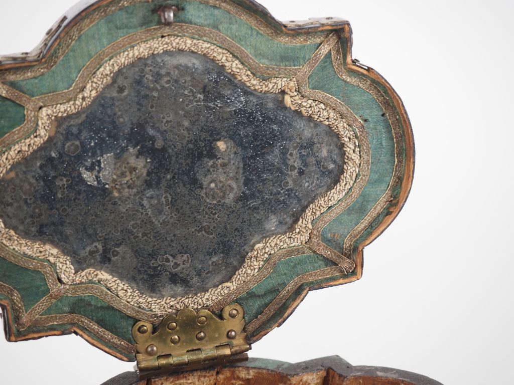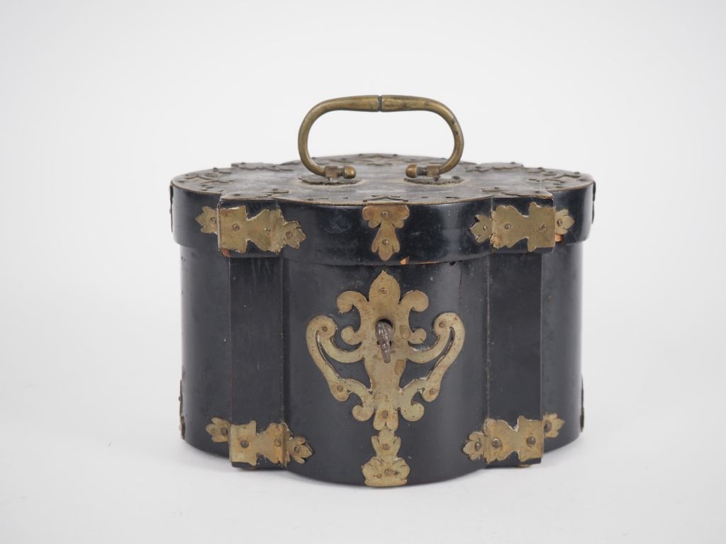 Boîte à bijoux Napoléon III en bois noirci, ornementation de laiton à décor feuillagé, ouvrant à un abattant sur un interieur à fond de glace. Dim. 10,5 x 16 x 12 cm. (Usures, accident à la charnière).