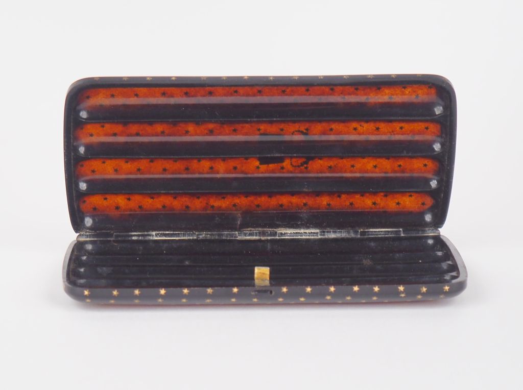 Boîte à cigares Napoléon III en écaille brune et or (ou pomponne), à décor d'étoiles, de fleurs et de blason. Dim. 14,5 x 7,5 cm.