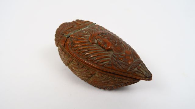 Boite à priser en corozo fin XVIIIème début XIXème, en forme de sabot et à décor de buste de personnage et de tête d'animal