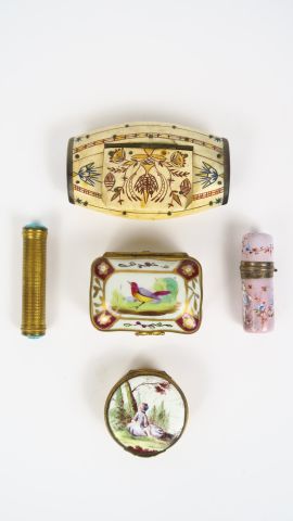 Boite à priser en os gravé , boite à pilules en porcelaine , flacon de parfum émail mauve décor d'ange , boite en émail décor de jeune fille , étui en métal doré décor de turquoise
