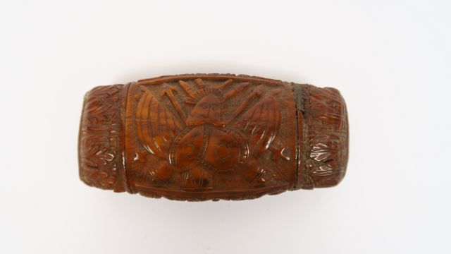 Boite à priser fin XVIIIème début XIXème en corozo sculpté, à décor de trophée militaire et de personnage