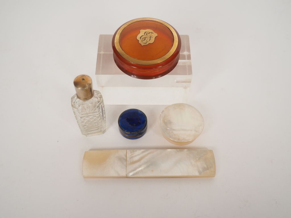 Boîte couverte en corne blonde et métal doré à décor d'initiales. Dim. 2 x 4,5 cm. Boîte à pilules circulaire et étui à aiguilles en nacre. Diam. 3,5 cm. H. 9,5 cm. Boîte à pilule circulaire en argent et émail. Dim. 0,5 x 2 cm. Flacon à sels en verre ou cristal taillé et argent. H. 6,5 cm.