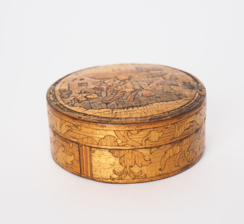 Boite cylindrique début XIXème en marqueterie de paille à décor de chasseurs. Dim. 2,5 x 6,5 cm.