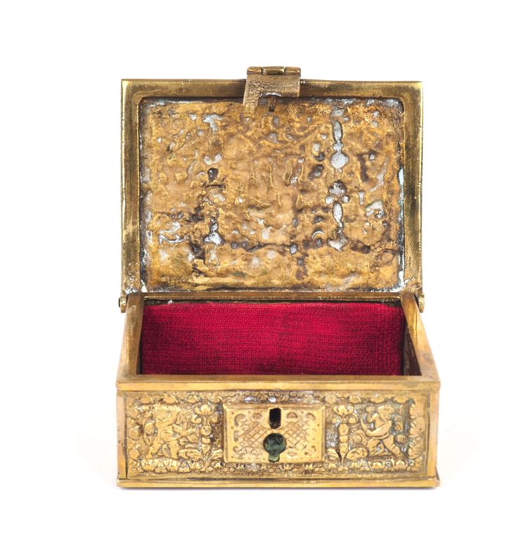 Boite de style Renaissance en bronze à décor d'amours dans un entourage de rinceaux feuillagé. Dim. 5 x 11.2 x 8.5 cm.