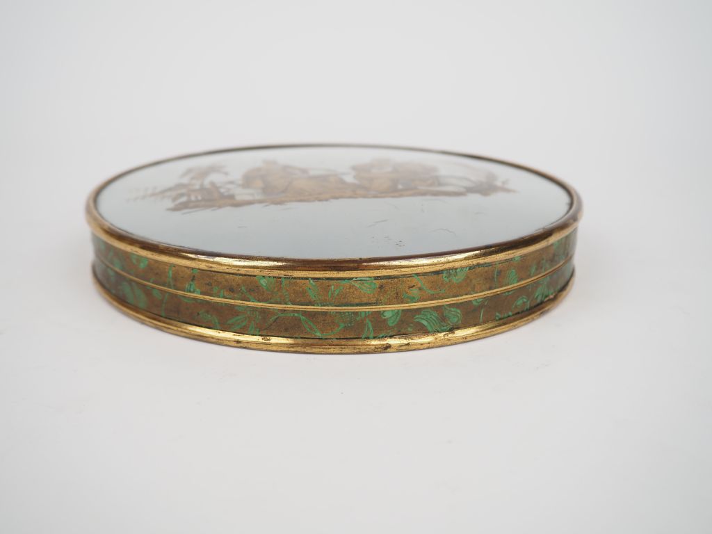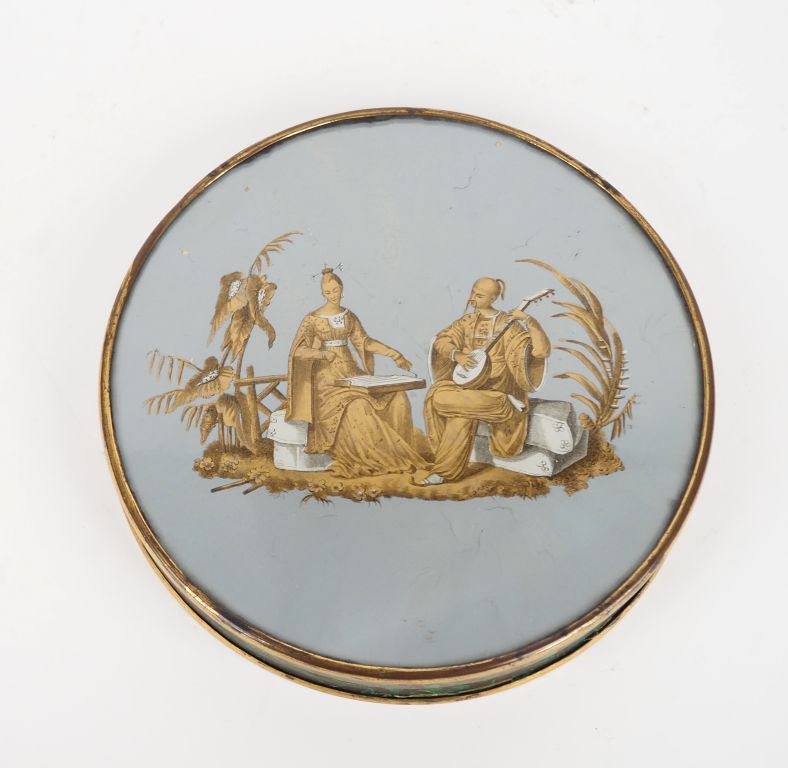 Boite Restauration en carton maché et fixé sous verre à décor de chinoiserie. Diam. 17 cm