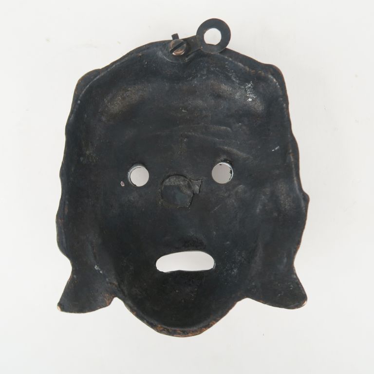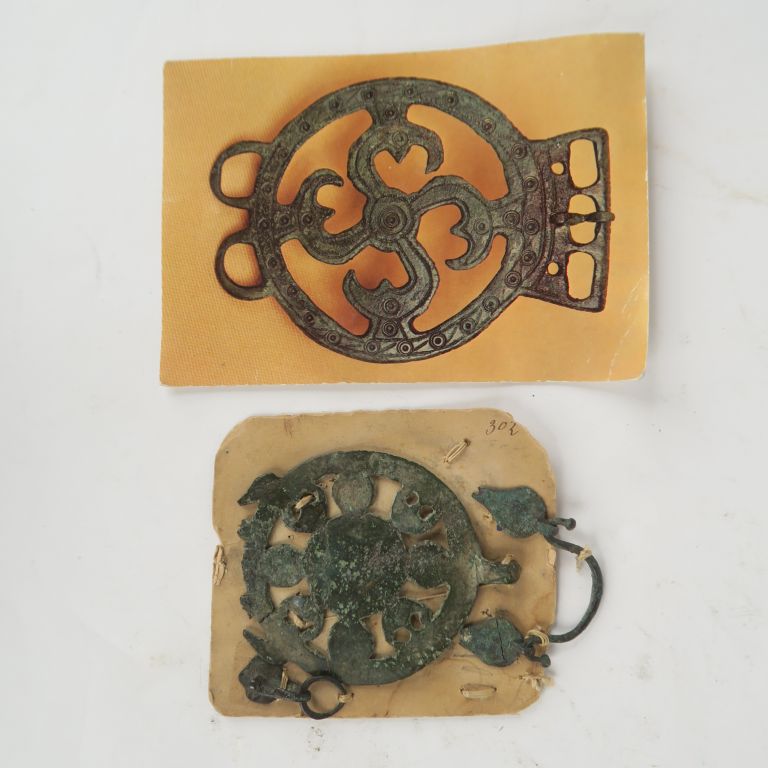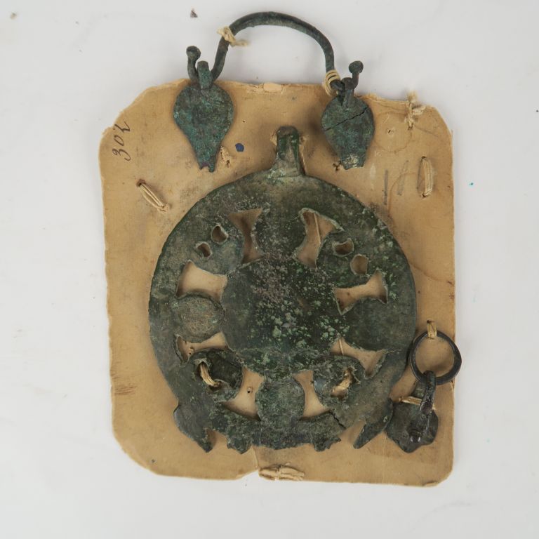Bronzes antiques. Une plaque ajourée à décor de peltes, une poignée et une agrafe cousues sur un carton portant un ancien numéro inscrit à l’encre. 8,7 x 7 cm. On joint un visage en bronze dans le style antique 8.5 x 7 cm.