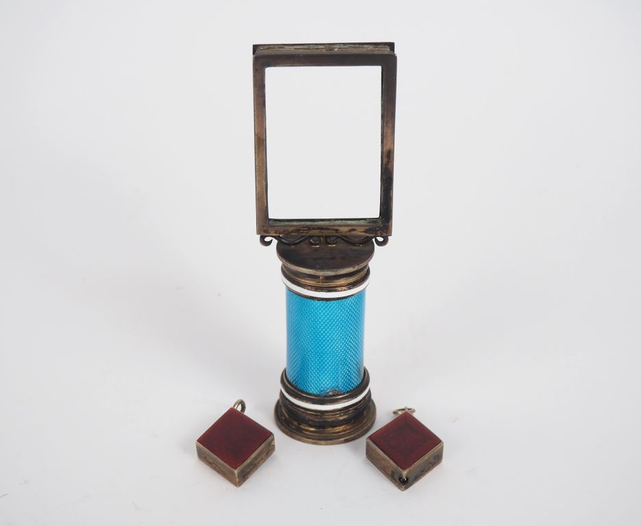 Cadre porte photo 1900 base émaillé bleue. H. 12,5 cm. On y joint un porte mine et une petit boîte en émail rouge. H. 3 cm.