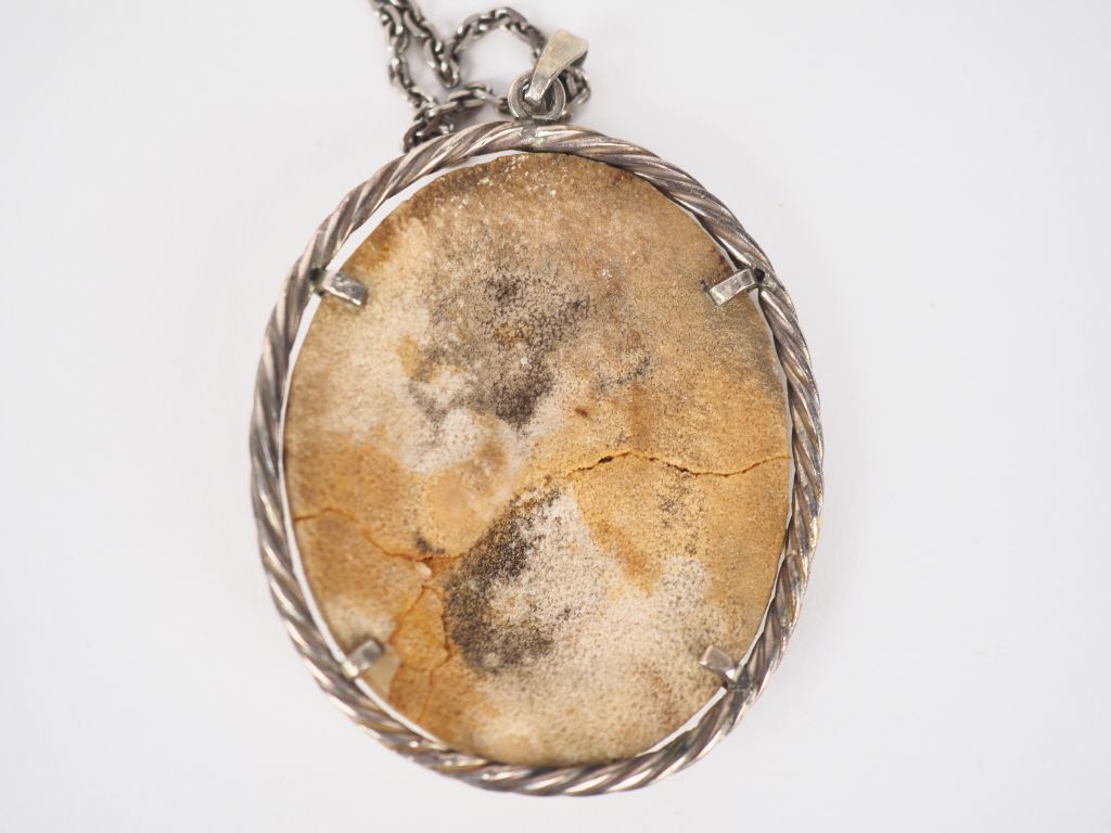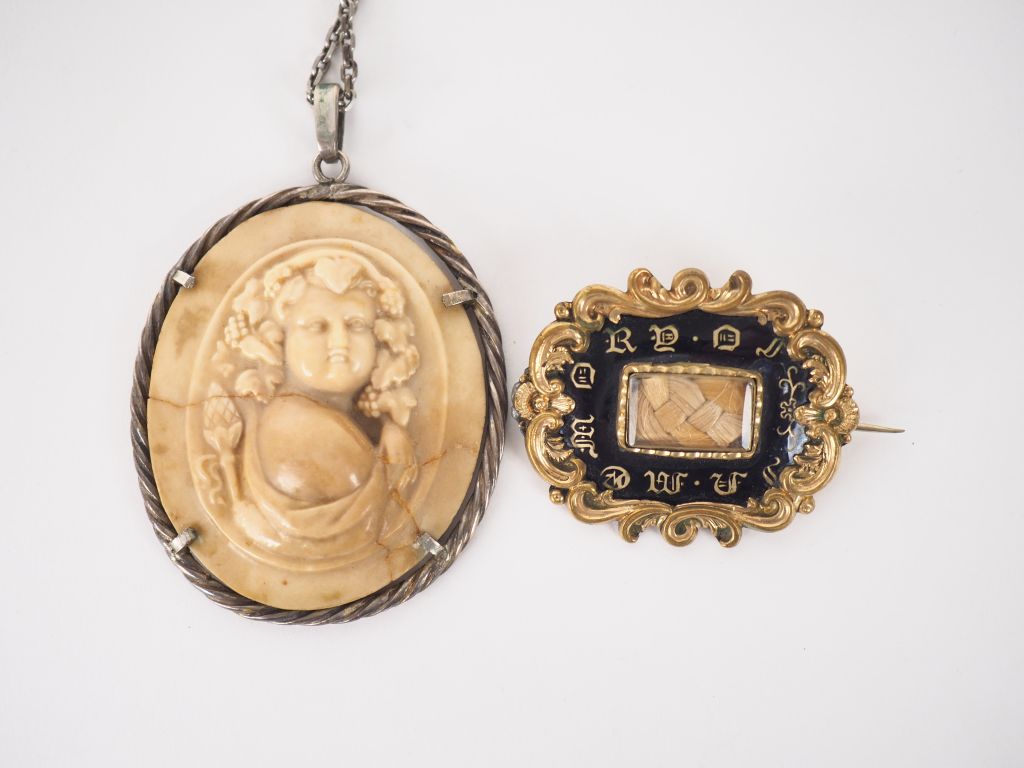 Camée XIXème en composition figurant Bacchus. Dim. 6 x 5 cm. (fel) On y joint une broche Napolén III en émail noir et métal doré contenant en son centre des cheveux tressés. Dim. 4,5 x 4 cm.