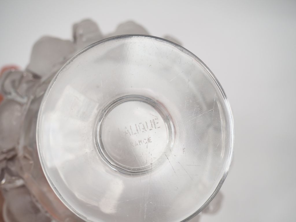 Cendrier Art Déco en verre en partie opalescent à décor de fleurs. Diam.10,5 cm LALIQUE. Vase Médicis à décor de frise de moineaux. H. 12 cm Signé